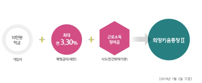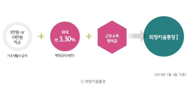 희망키움 통장은 1, 2 두 가지로 나뉘어 있습니다. 먼저 1은 본인이 5만 원 혹은 10만 원씩 적금을 들면 근로소득 장려금을 적립받을 수 있습니다.