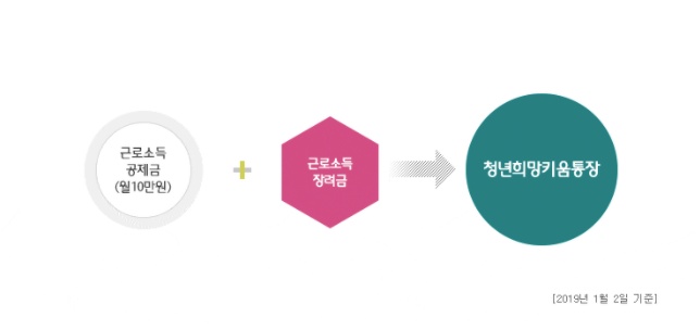 근로소득 공제금 10만 원과 함께 근로소득 장려금을 지원하는 청년 희망키움 통장입니다. 근로소득 장려금의 경우 월 소득에 따라 비례책정되며 월 81만원 기준으로 39.5만원 지원됩니다.