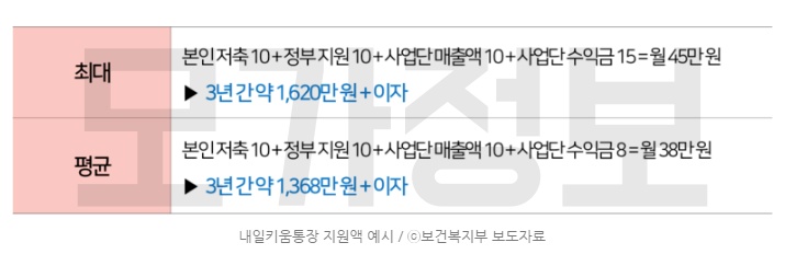 내일키움 통장 개설하고 난 뒤 매월 10만 원씩 저축하면서 위에 나열된 조건에 해당이 된다면 3가지 지원금을 받을 수 있습니다. 정부지원(내일 근로장려금), 사업단 매출액(내일키움 장려금), 사업단 수익금(내일키움 수익금)입니다.