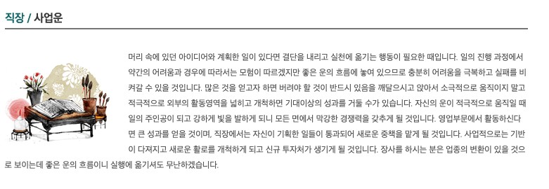 승진에 대한 고민이 있다면 직장, 매출 및 확장에 대한 고민이 있다면 사업운 파트를 참고하면 되겠습니다.