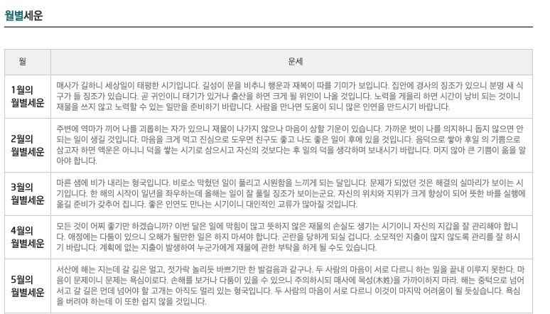 재미있는 부분은 월별 세운도 있다는 점입니다. 세부적으로 확인할 수 있기 때문에 재미 삼아 1월부터 12월까지 매월 운세를 그때마다 확인하는 것도 흥미롭겠네요.