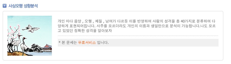 사상 오행 성향분석도 눈에 띕니다. 개인마다 반영하는 성격이 다르며 개인의 이름, 생일만으로 분석할 수 있다고 합니다.