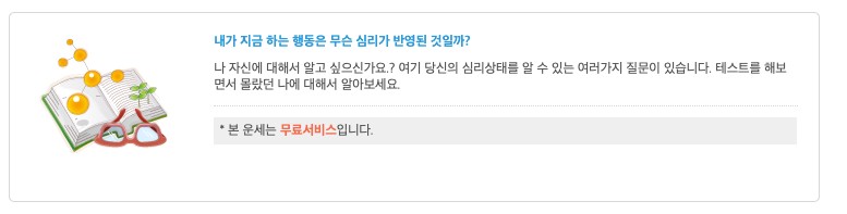 이 중에 심심풀이로 할 만한 심리테스트를 진행해보았습니다. 본인의 성향을 어림잡아 파악하는데 유용한 서비스입니다.