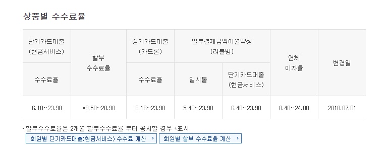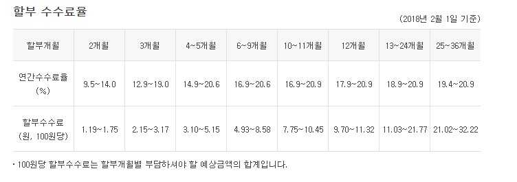요율은 다양하게 개월에 따라 달라지므로 참고하시면 되겠습니다. 100원당 할부수수료도 있어서 계산하기 수월 하겠네요.