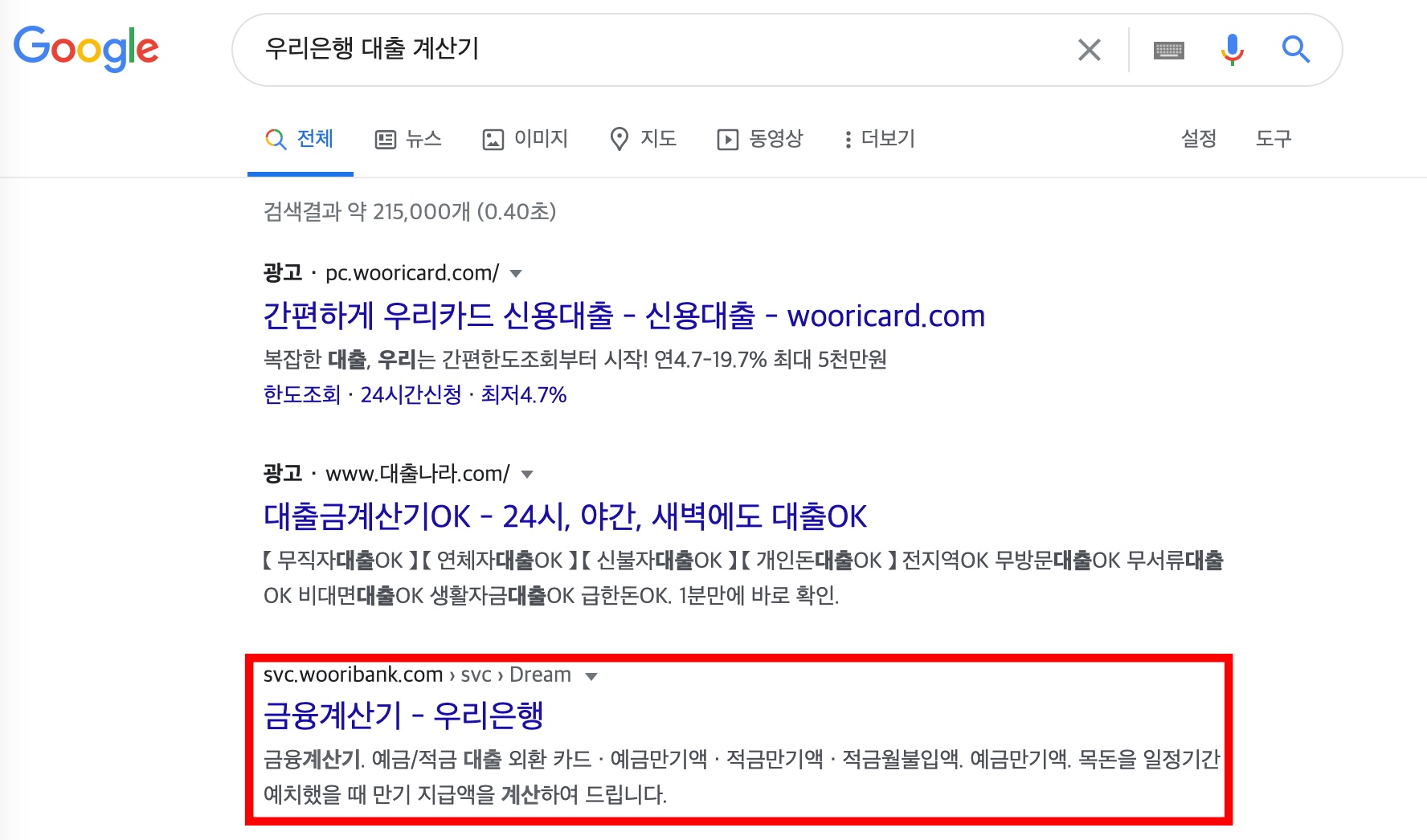 우리은행 또한 국민은행과 마찬가지로 우리에게 친숙한 은행입니다. 똑같이 검색 포털 사이트 [우리은행 대출 계산기] 검색합니다.