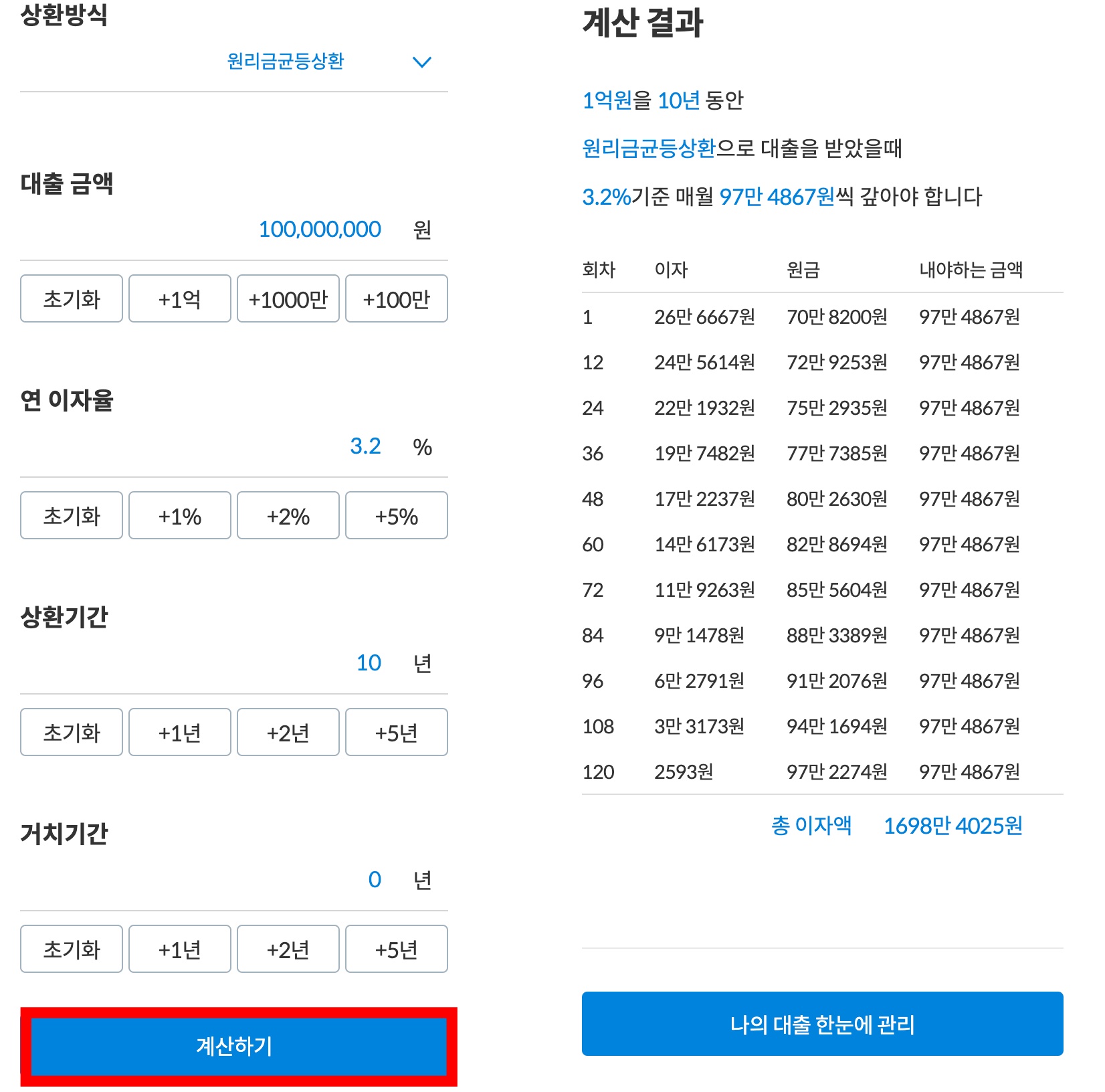 이번에는 1억 원을 10년 동안 3.2% 금리로 계산을 해보았습니다.