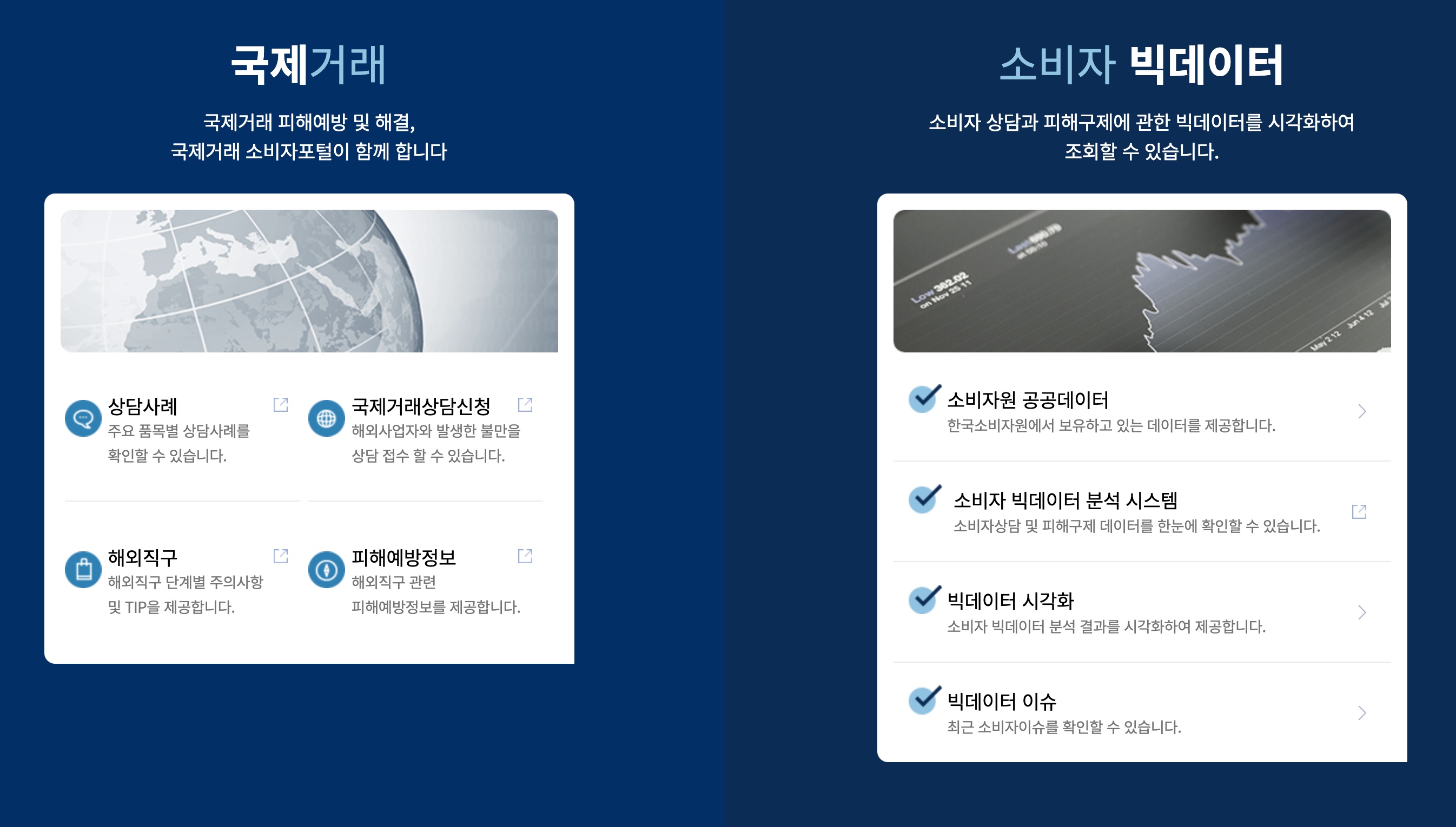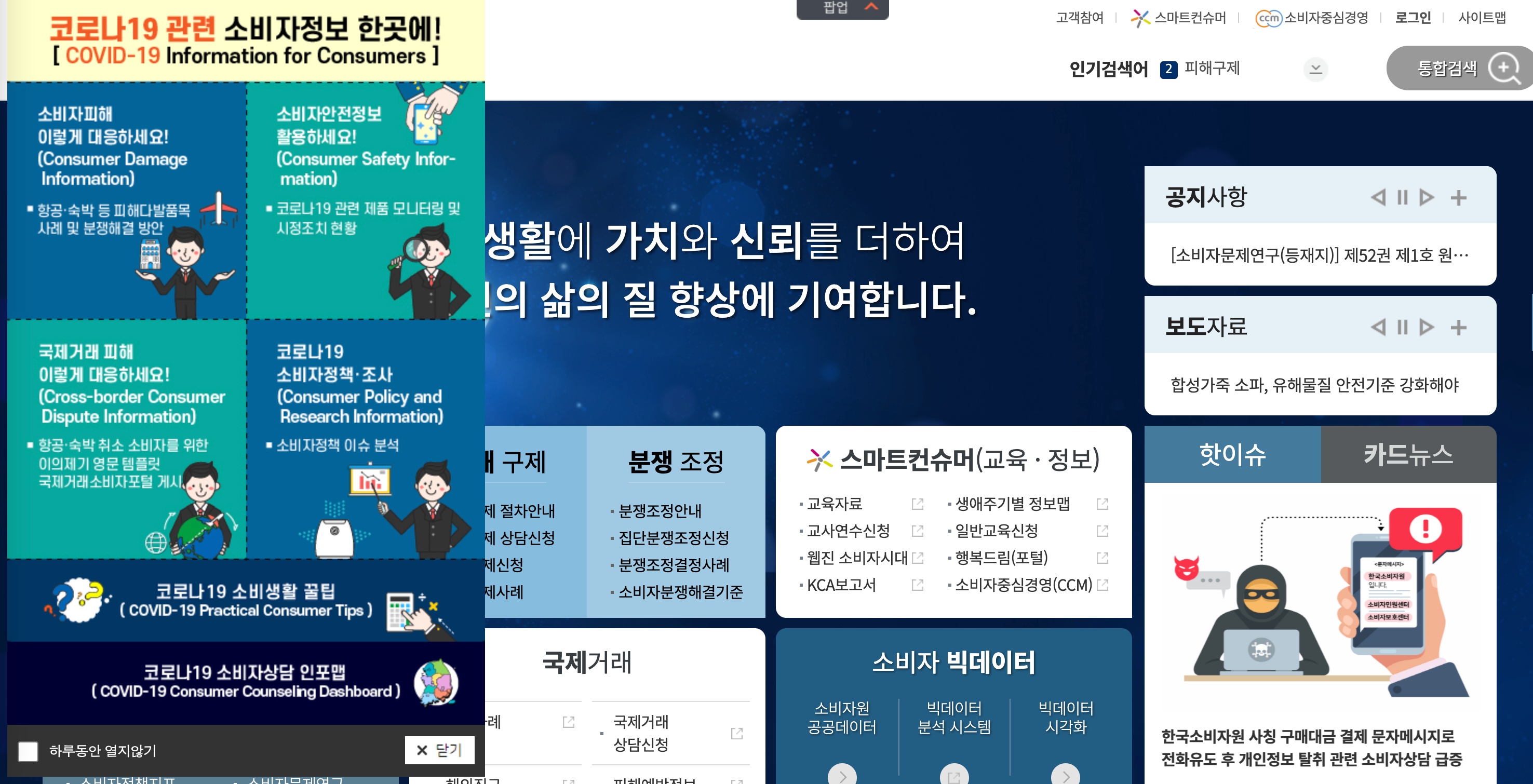 이제 세부 메뉴에 대해 본격적으로 살펴보도록 하겠습니다. 가장 먼저 눈에 띄는 창은 현 시국에 피해받은 소비자를 위한 정보들인데요. 생활에 가치와 신뢰를 더하여 삶의 질 향상에 기여한다는 슬로건이 눈에 띄네요. 아무래도 정부에서 운영하는 공공기관이다 보니 국민을 위해 만들어진 사이트임을 바로 확인할 수 있었습니다. 그 외에도 피해 구제와 분쟁 조정, 스마트 컨슈머 교육 정보, 국제 거래, 소비자 빅데이터 등을 한눈에 체크 가능합니다.