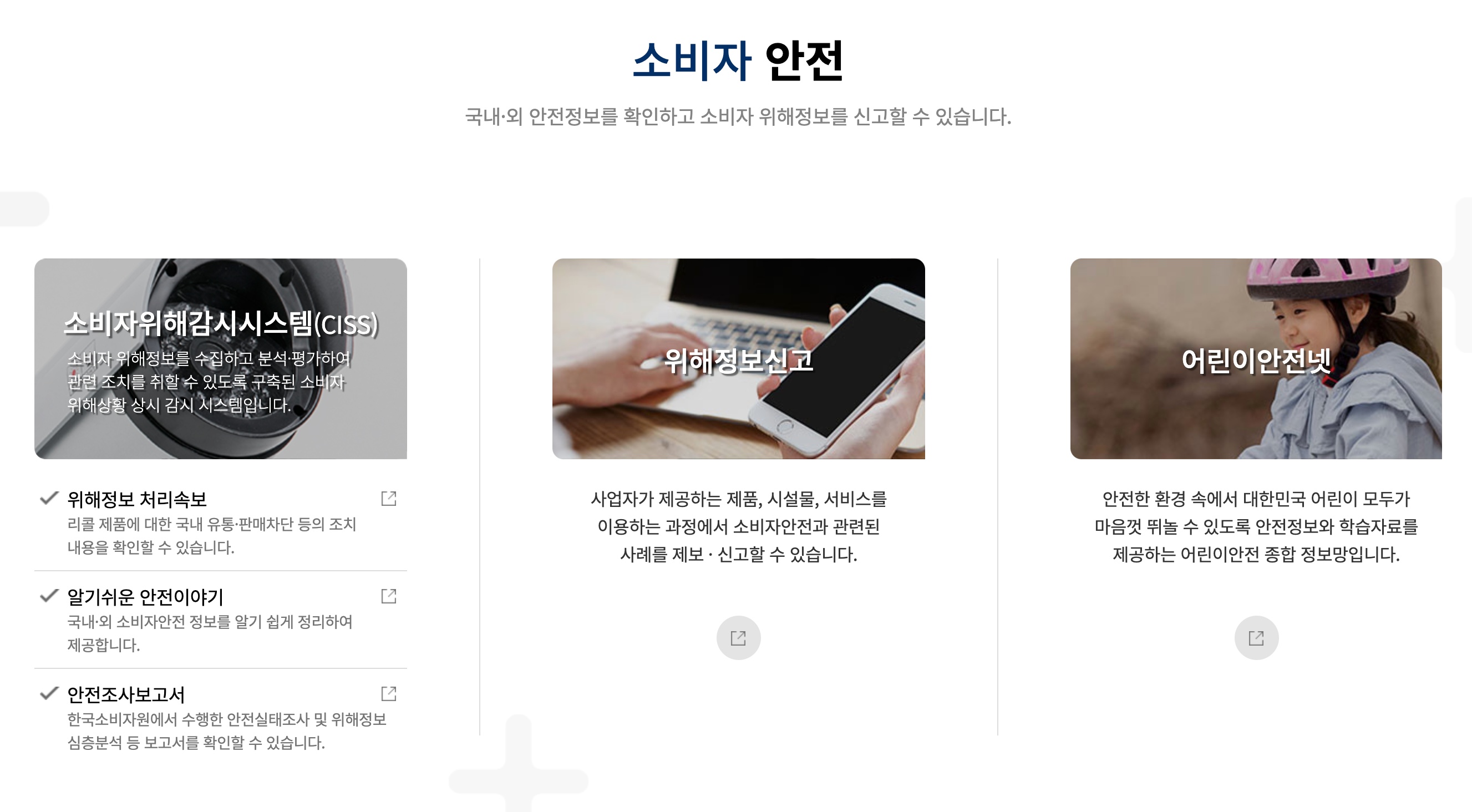 그중에서도 역시 소비자 안전 부분이 가장 메인인 것 같습니다. 왼쪽부터 차례대로 위해감시시스템(CLSS), 위해정보신고, 어린이 안전넷이 있는데요. 위해 정보를 빅데이터로 수집하고 분석 및 평가 후 조치를 취할 수 있도록 시스템을 구축했다는 설명글입니다. 한마디로 항상 감시하겠다는 말이겠죠?
