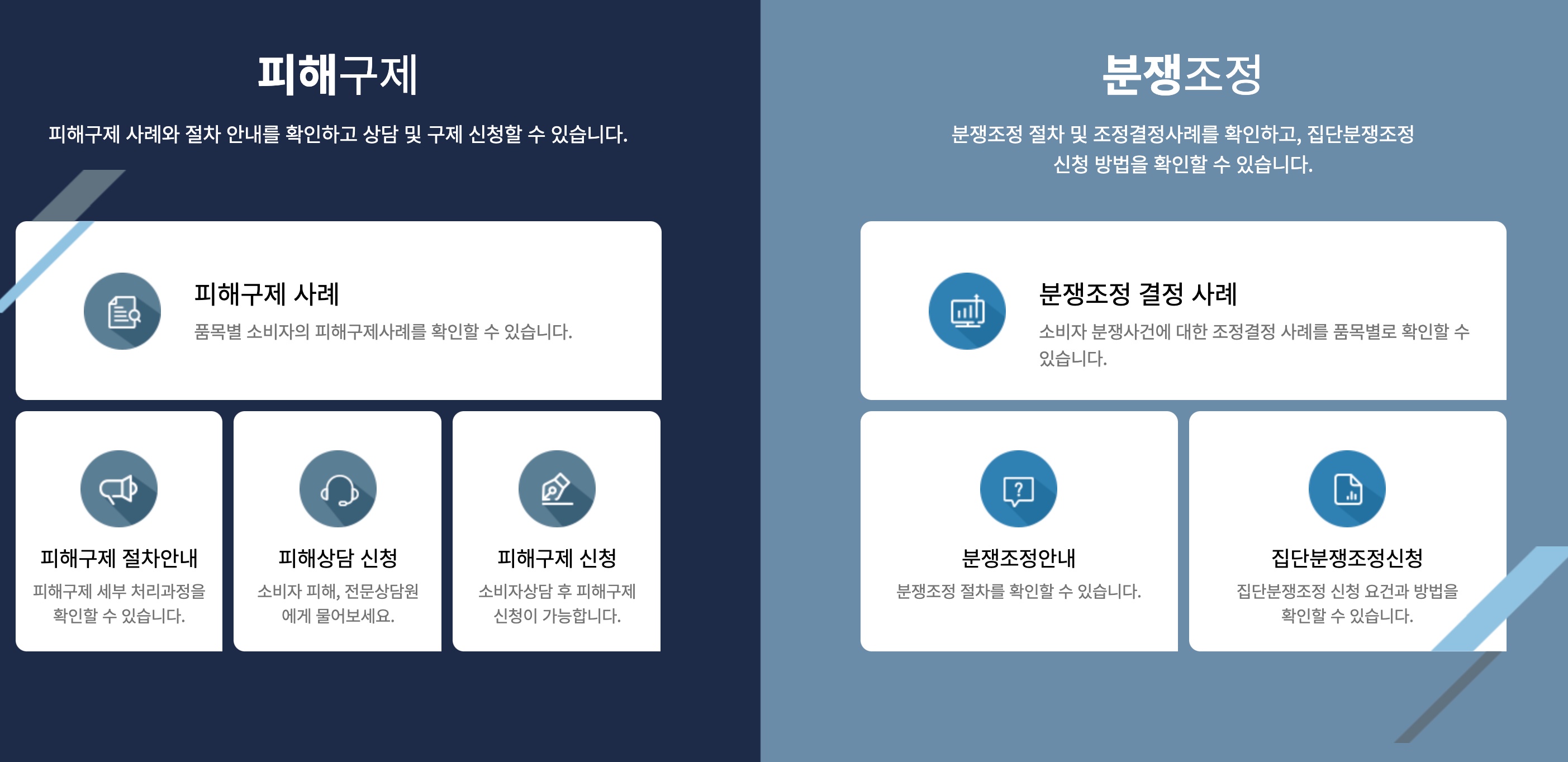 이번에는 피해구제와 분쟁조정에 관련된 화면입니다. 굳이 메뉴를 클릭하지 않아도 스롤만 내리면 바로 보이는 부분이에요. 이 부분은 역시 품목별로 일어난 피해 사례를 확인하여 절차를 안내받고 상담 신청 및 피해구제 내용을 신청할 수 있습니다. 더불어 중간에 조정결정 사례도 포함하고 있으니 본인에게 맞는 매뉴얼을 선택하시면 될 것 같아요. 혹시 상세 내용이 잘 안 보이시는 분들은 이미지를 클릭하여 크게 확인해 보시길 바랍니다.