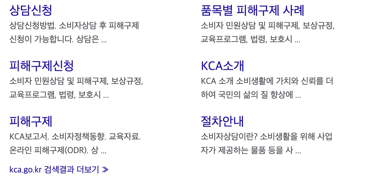 저의 경우 구글을 자주 이용하기 때문에 구글 검색창을 통해 검색해 보았는데요. 보시는 것처럼 공식 홈페이지뿐만 아니라 바로가기 퀵 메뉴도 확인되더라고요. 아마 저와 같은 헬스장 환불 건이나 불합리한 일들을 겪은 분들이 많은가 봅니다. 메뉴는 불만사항에 대한 상담 신청과 품목별 피해받은 사람들을 위한 피해구제 사례 서비스, 절차 안내 등이 있고요. 이는 권익 향상에 대한 정보를 받아 볼 수 있는 것이니 한 번쯤 편하게 이용하셔도 될 것 같아요.
