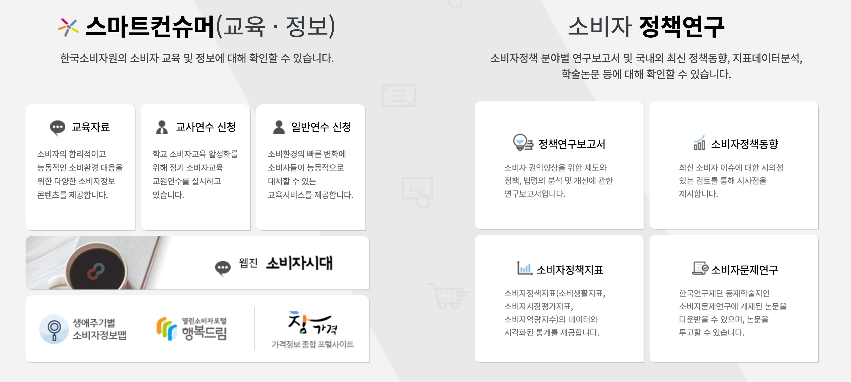 다음은 방향성을 볼 수 있는 페이지입니다. 스마트컨슈머 교육 및 정보인데요. 평소 합리적이고 능동적인 소비환경 대응을 위한 다양한 콘텐츠를 제공하며 학교 내 교육을 활성화하기 위해 정기적으로 교원연수를 실시한다고 하더라고요. 게다가 일반인이 신청할 수도 있다고 하니 관심 있으신 분들은 한 번쯤 참고하시기 좋을 듯해요. 보조 메뉴로는 웹진과 관련 포털 사이트가 있습니다. 오른쪽에 있는 정책연구는 전문가들이 국내외 최신 정책 동향을 도모하고 지표 데이터를 분석하며 학술논문을 모아둔 자료라고 합니다. 가끔씩 저도 읽어 보고 있는데 좋은 자료라 저도 종종 애용하고는 하거든요.