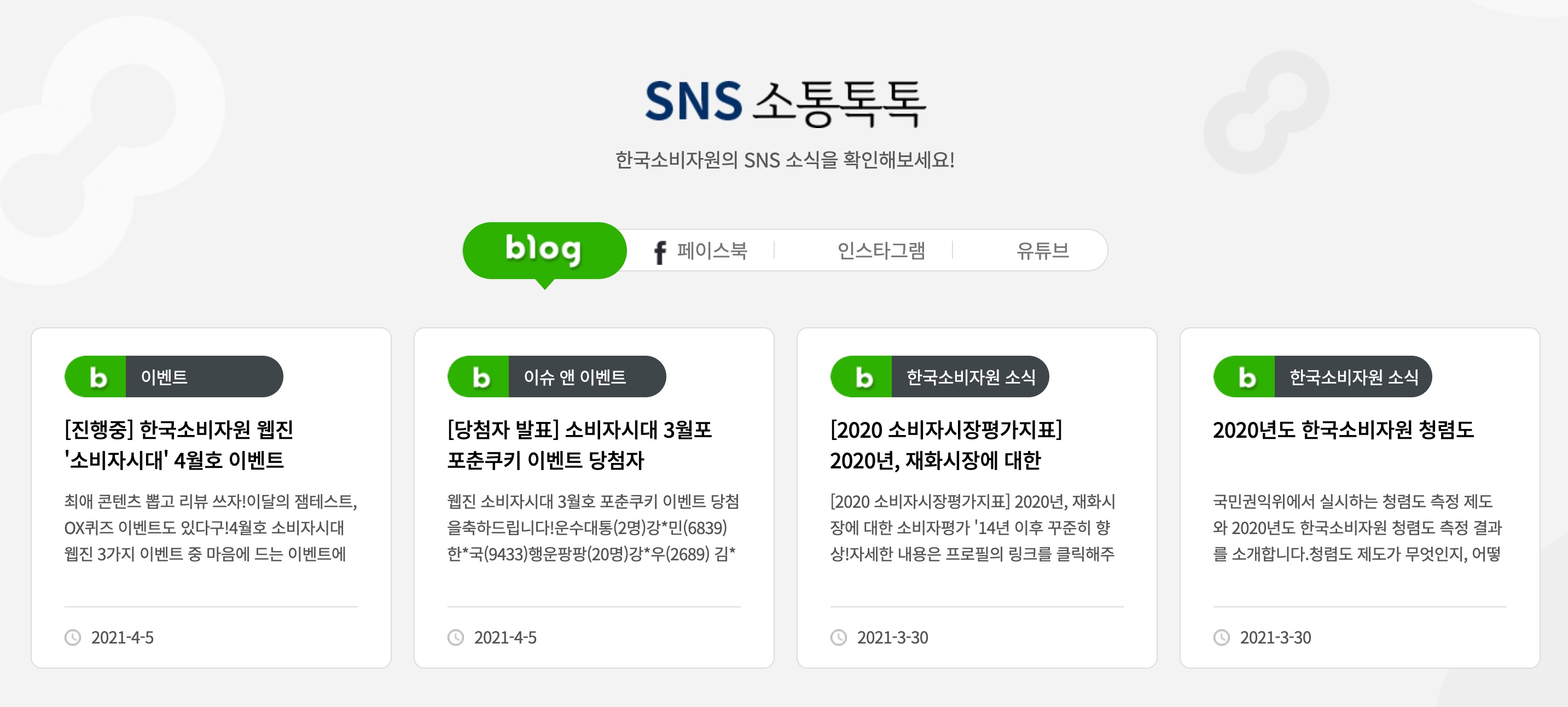마지막으로 소식을 바로바로 직접 확인할 수 있는 SNS 소통톡톡과 전화번호를 알려 드리며 마치도록 하겠습니다. 운영 서버는 네이버 블로그뿐만 아니라 페이스북, 인스타그램, 유튜브까지 개설되어 있는데요. 본인이 접하기 쉬운 채널을 선택하여 유용한 정보를 얻기 좋을 것 같습니다. 요즘에는 소비자시대 4월호 이벤트를 진행하고 있네요.