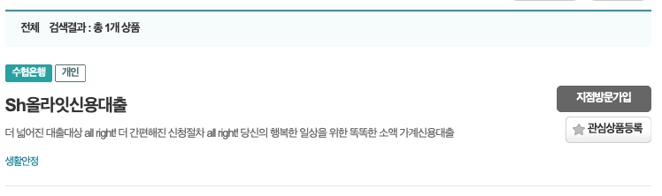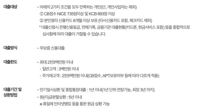 먼저 소개드릴 상품은 Sh올라잇 신용대출인데요. 재직 유무 관계없이 신용등급 5등급 이상(NICE 735점 이상, KCB 693점 이상)이거나 본인 명의 신용카드를 6개월 이상 보유하고 있는 분이시라면 누구나 신청 가능한 상품입니다. 하지만 개인사업자의 경우나 연체자, 과다 기대출자는 신청에 제한이 있기 때문에 그 외 일반 고객만 가능하다는 점 유의해 주시길 바랍니다.