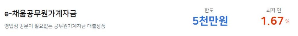 다음은 e-채움가계자금 상품입니다. 이는 영업점 방문 없이 모바일로만 신청할 수 있는 금융 상품인데요. 인터넷뱅킹 가입 고객을 대상으로 다른 은행에서 동일 종류의 대출(퇴직 사실 통보 조건)을 받지 아니한 연금법 적용대상입니다. 상환 기간은 최장 10년 이내이며 상환 방법은 만기일시 또는 원리금균등분할부로 가능합니다. 몰론 마이너스통장으로도 가능하고요. 재직 기간에 따라 한도가 차등 적용되므로 참고 바랍니다.
