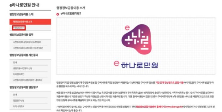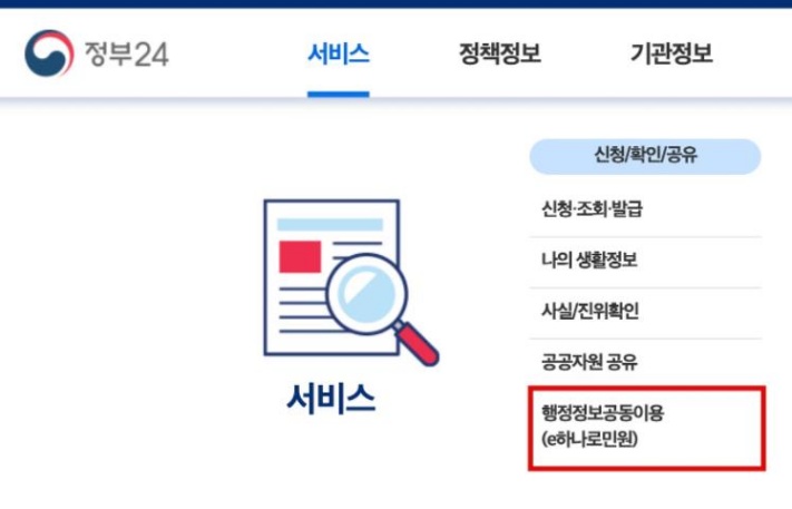 - 정부24 메인 상단 서비스 메뉴 중 '행정정보 공동이용(e하나로 민원)'을 클릭.