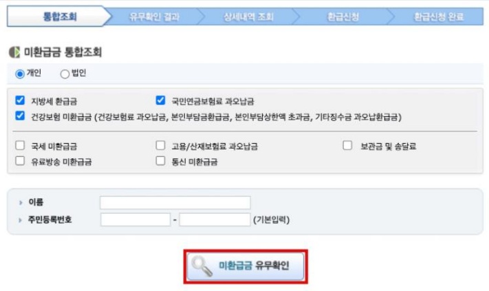 - 국세환급금 조회에서 개인이나 법인 중 해당 사항 체크 후 다음 항목 선택-이름 및 주민등록번호 기재.