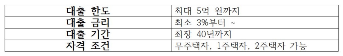 만 19세 이상의 성인으로 신청일 기준 무주택자 또는 구입용도에 한한 1주택자라면 누구나 신청 가능합니다. 만약 본인이 2주택자라고 하더라도 신청일 기준 6개월 이내에 처분한다는 조건을 내세운다면 일시적 2주택 허용되는데요. 아마 보금자리론과 같은 주담대를 알아보셨다면 대부분의 이용 대상 및 자격조건은 동일하기 때문에 따로 자세한 설명은 드리지 않겠습니다만, 가장 큰 차이점은 소득 요건에 관한 부분이라고 볼 수 있습니다.