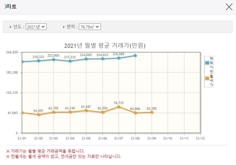 또한 위 사진에서 따로 표기해 놓은 '차트' 버튼을 클릭하시면 그래프로 월별 매매가 및 월세 전세 등락률도 확인할 수 있습니다. 이렇게 국토부 아파트 실거래가 조회 통해 시세를 먼저 확인하게 되면 현재 분양가가 어떤지 전월세 금액은 어느 정도인지 쉽게 비교할 수가 있는데요.