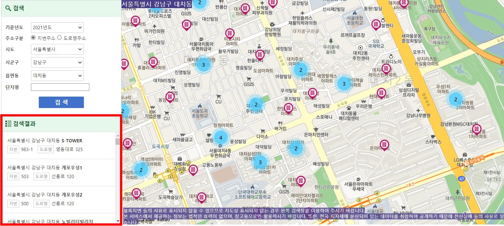 원하는 메뉴를 선택하여 들어가시면 좌측 부분에 검색란이 나오는데, 여기서 알아보고자 하는 동네를 설정해 주시면 됩니다. 저는 예시로 집값 폭등의 진원지라고 일컫는 서울특별시 강남구 대치동 은마아파트를 샘플로 보여드리려고 하는데요.