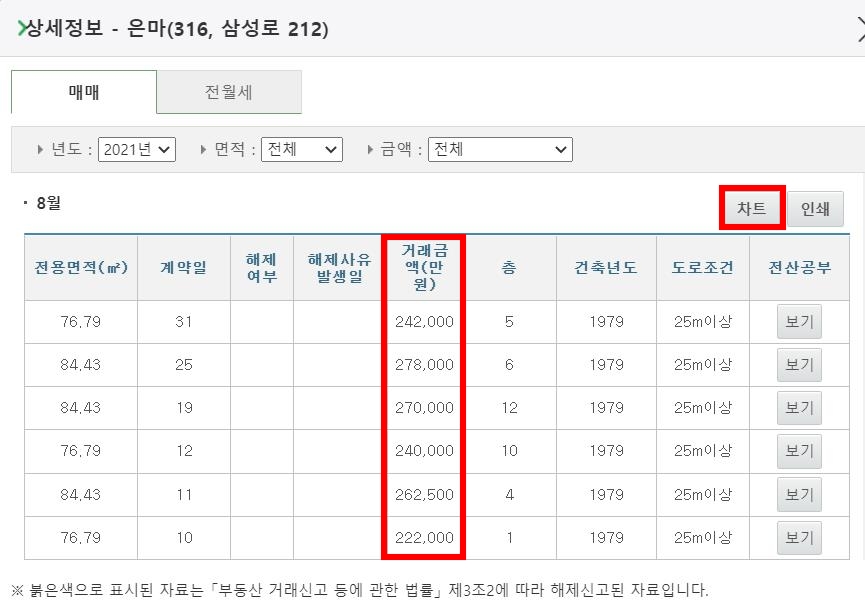 2021년 8월 매매실거래가격을 조사해 봤더니 27억 8천만 원까지 거래된 것을 알 수 있네요. 지난 달에는 평균 23~24억 정도로 거래되고 있는데 불과 4년 만에 2배가 되었습니다. 금액뿐만 아니라 전용면적별 계약일, 거래대금, 층수까지 모두 확인 가능한데요. 스크롤을 아래로 내려보면 7월, 6월 등에 거래된 모든 정보가 상세하게 나오므로 현재 시세가 어떻게 되는지 한눈에 알아 볼 수 있어 편리하죠.